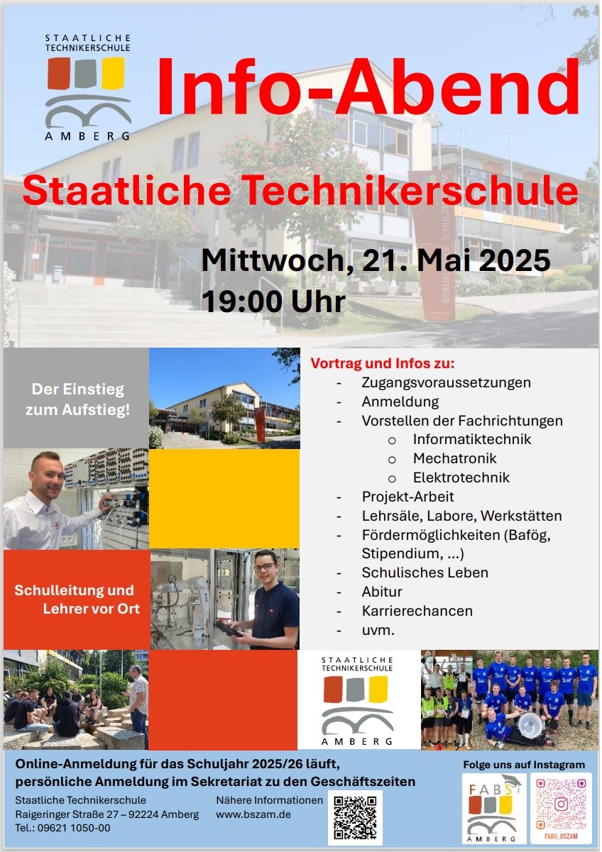 Dann kommen Sie am Mittwoch, den 21. Mai 2025 um 19 Uhr zum Infoabend der Staatlichen Technikerschule Amberg in die Aula des BSZ Amberg!